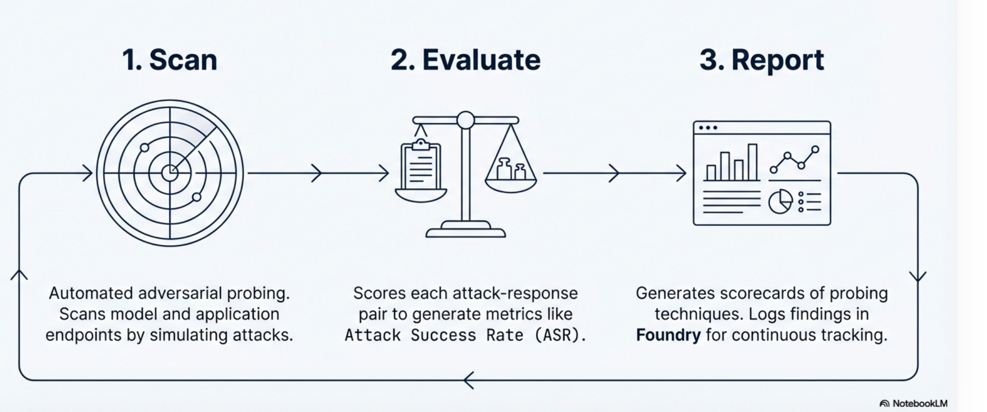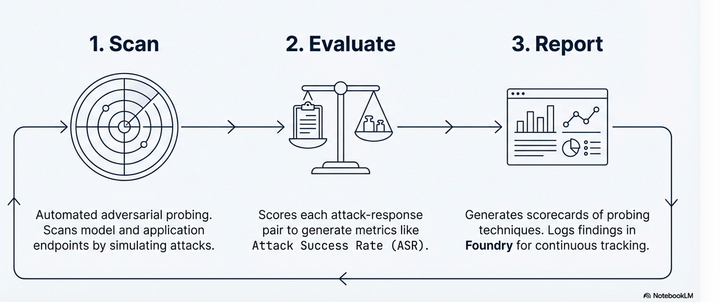 Powered by PyRIT (Python Risk Identification Toolkit) and integrated with Microsoft Foundry’s Risk & Safety Evaluations, the Red Teaming Agent operates on a continuous three-phase cycle: