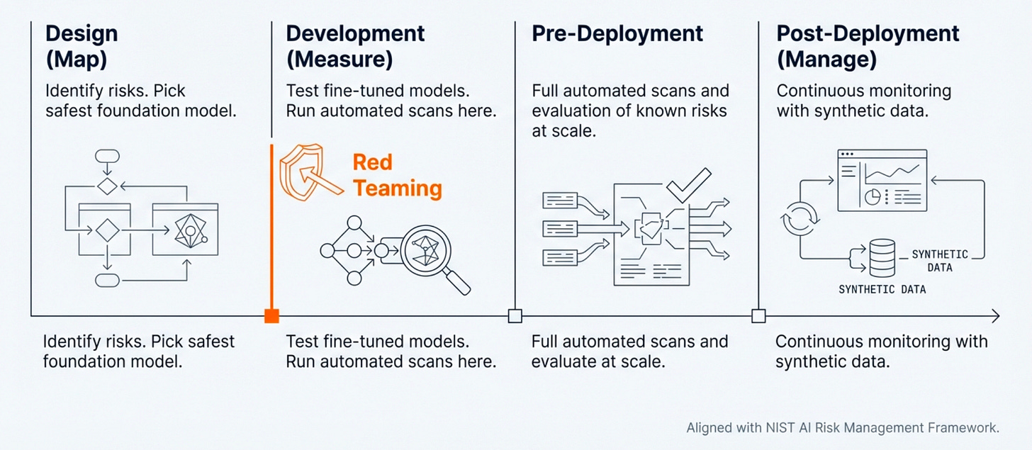 Development Phase (Measure): Test fine-tuned models with automated scans during training and iteration. This is where the Red Teaming Agent provides maximum value catching vulnerabilities before deployment.